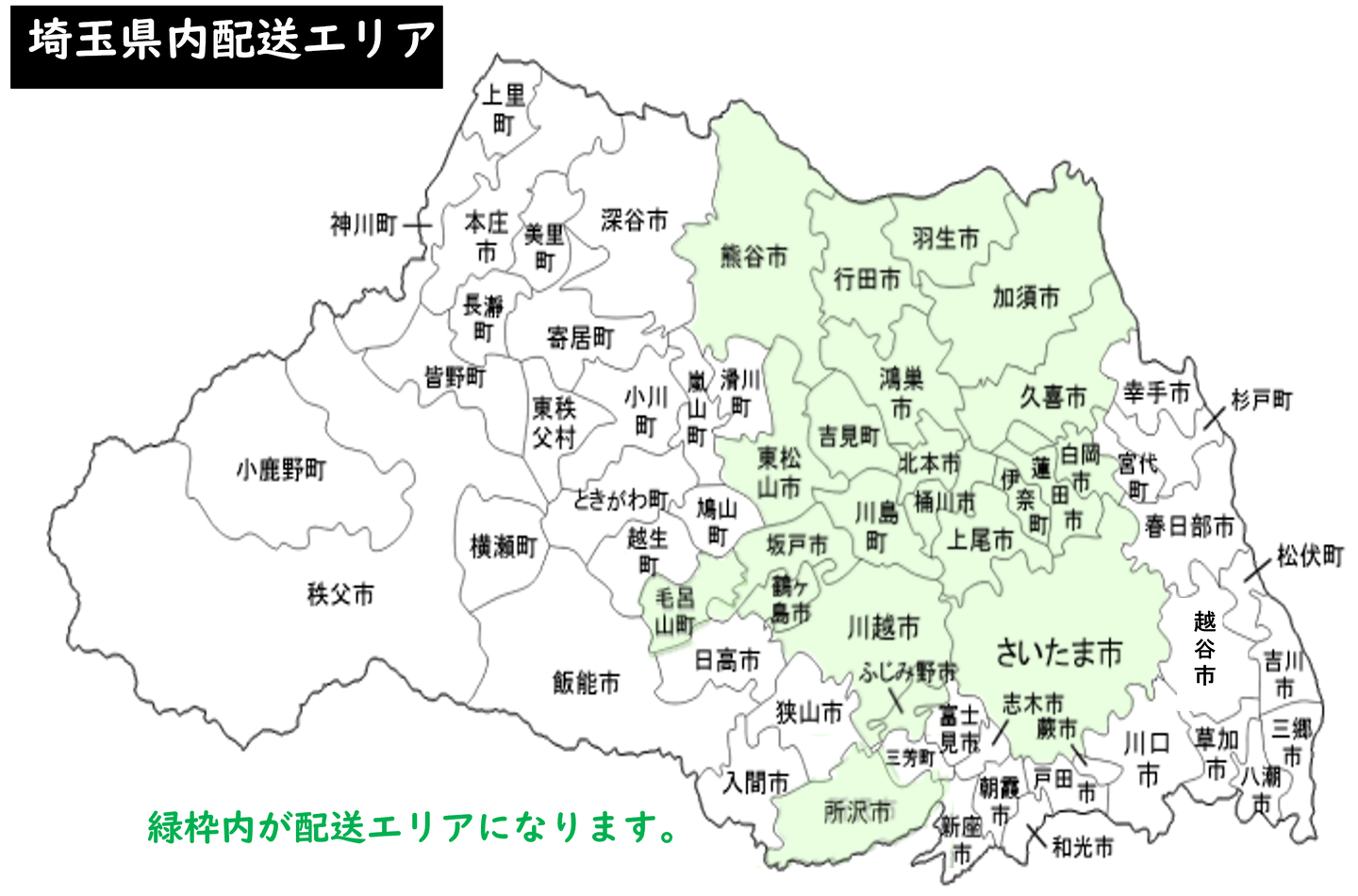 上記に加え、さいたま市(見沼区、西区、中央区、岩槻区、浦和区) 鴻巣市、川越市、東松山市、川島町、吉見町、蓮田市、白岡市、行田市、坂戸市、鶴ヶ島市、久喜市、ふじみ野市 |